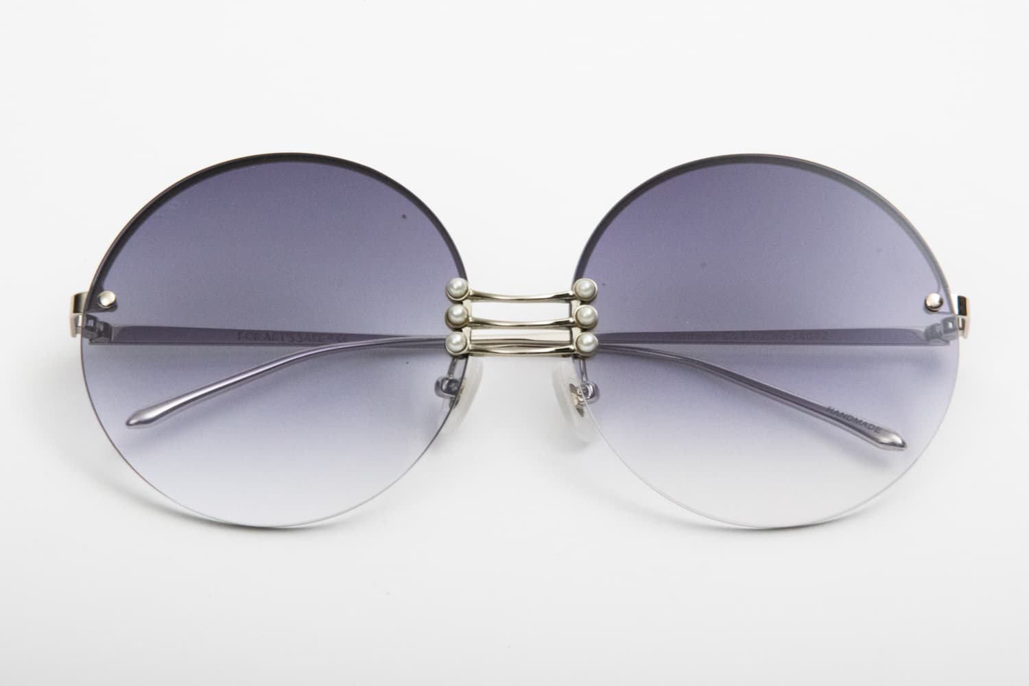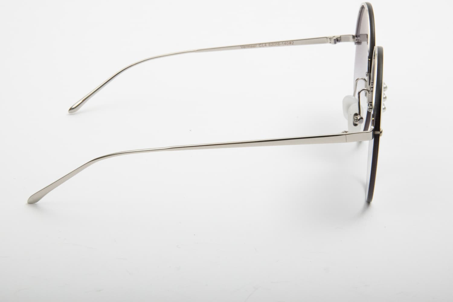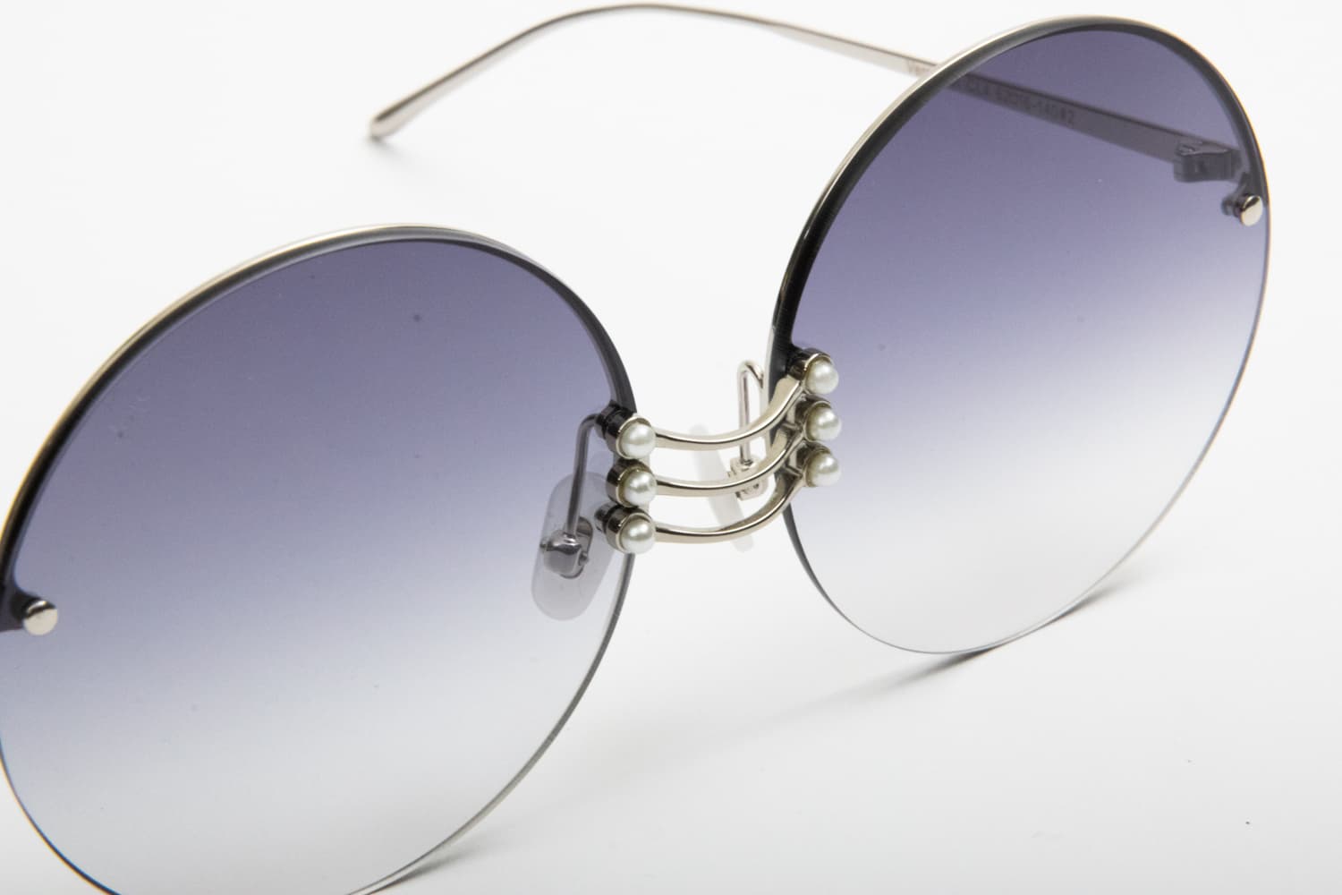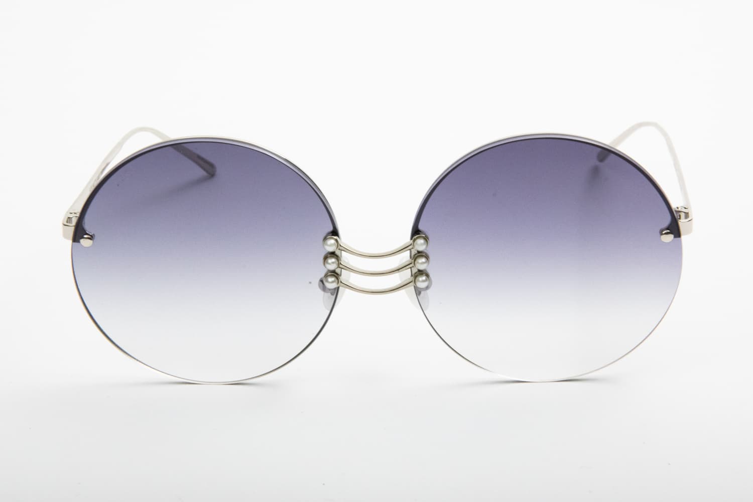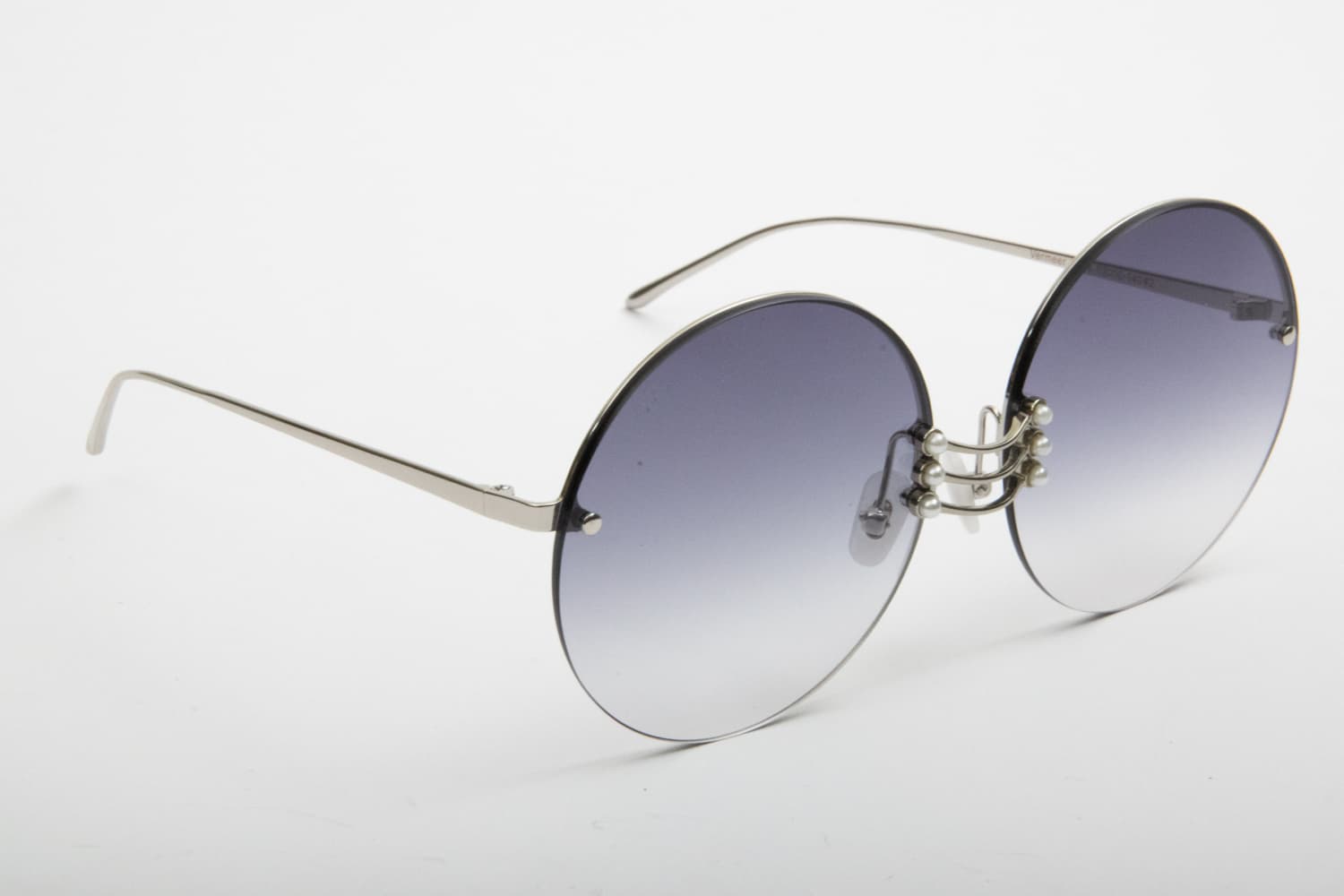 Un occhiale da Sole in metallo leggerissimo, una montatura a giorno, senza montatura intorno ed aste avvitate alle lenti. Lenti dal colore grigio fumo, rotonde e sfumate. Il ponte è particolare in metallo con perline al bordo della lente: un tocco chic su una montatura tutta femminile al 100%!